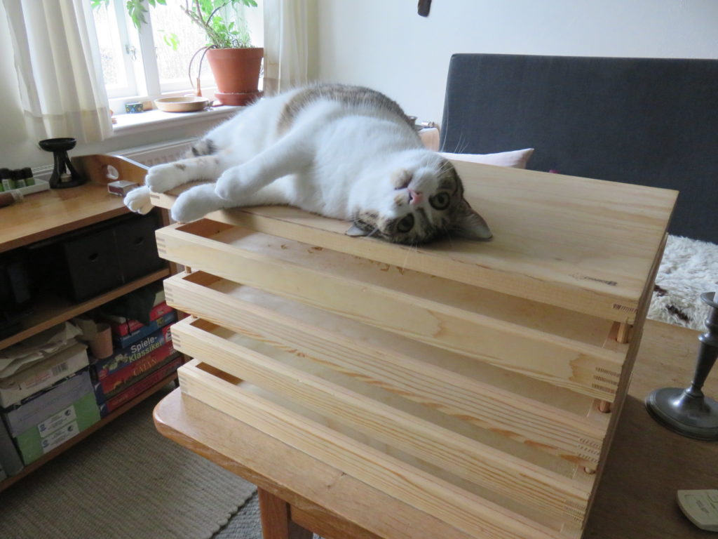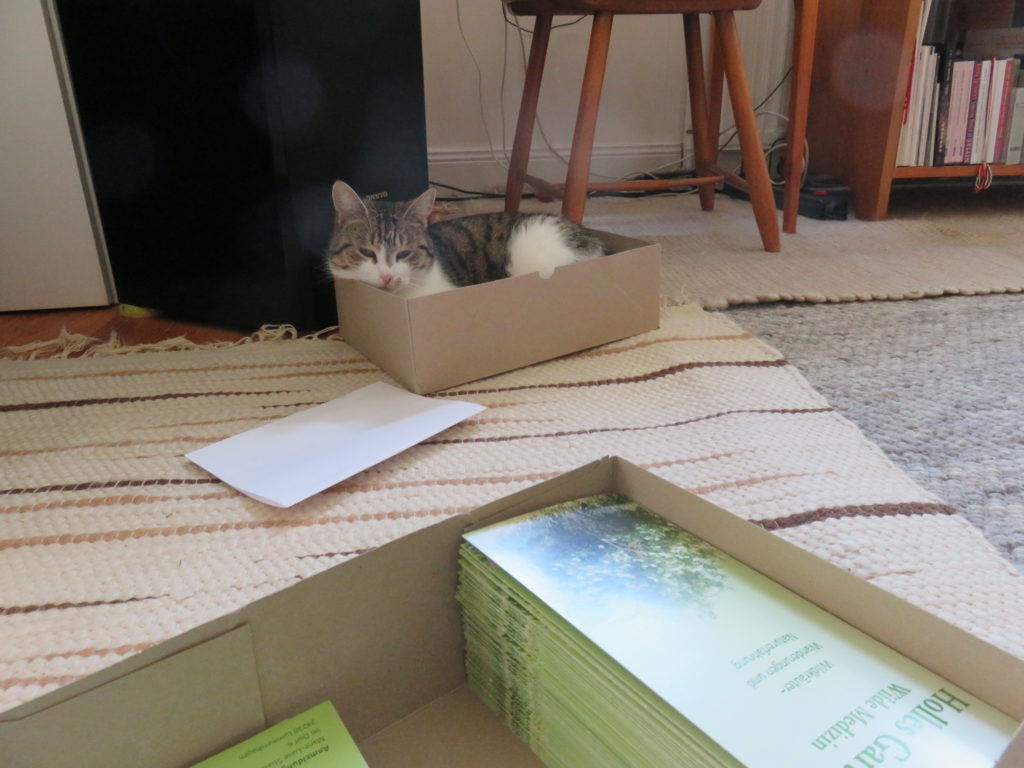 Die Flyer für meine diesjährigen Kräuterkurse sind fertig und Lenchen hat es sich im Deckel des Kartons bequem gemacht.