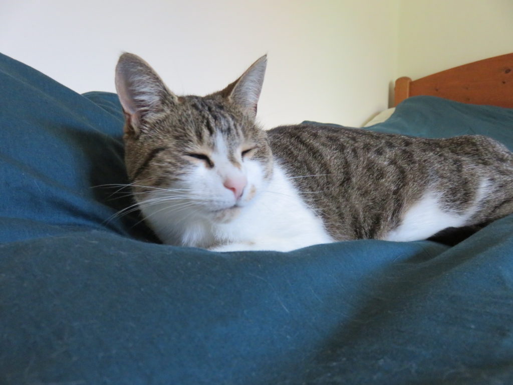 Wenn ich meine Katze ansehe, wie sie den allergrößten Teil des Tages irgendwo tiefenentspannt rumliegt und ratzt, muss ich Robert Gernhardt recht geben. Was für ein beneidenswertes Wesen! Ich beneide sie nicht nur für diese tiefe Entspanntheit sondern auch dafür, daß sie ohne Gepäck reist. Katzen haben alles am Leib, was sie brauchen: spitze Zähne, geschmeidige Muskeln, extrem gut entwickelte Sinne, noch dazu solche, von denen wir keine Ahnung haben. Sie brauchen kein Haus, keine Kleidung, kein Auto, kein Smartphone, keine Gesetze. Sie lassen sich nicht beherrschen, sie leben völlig im Jetzt. Ich glaube, ein großer Teil unserer Unfreiheit hat mit Besitz zu tun. Also: liegen lernen! Und liegend und schlafend zur Erkenntnis kommen, wann aufstehen und handeln erforderlich ist.