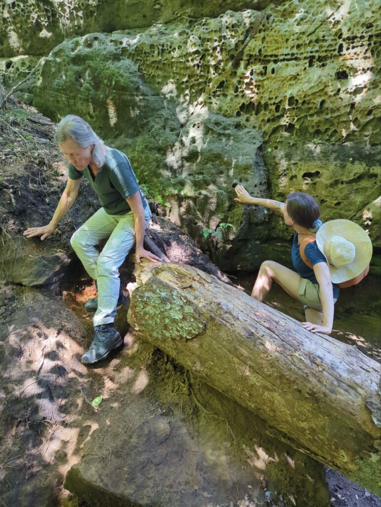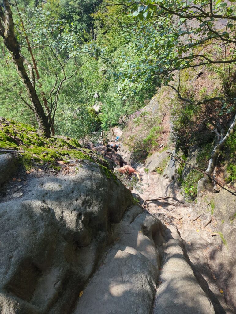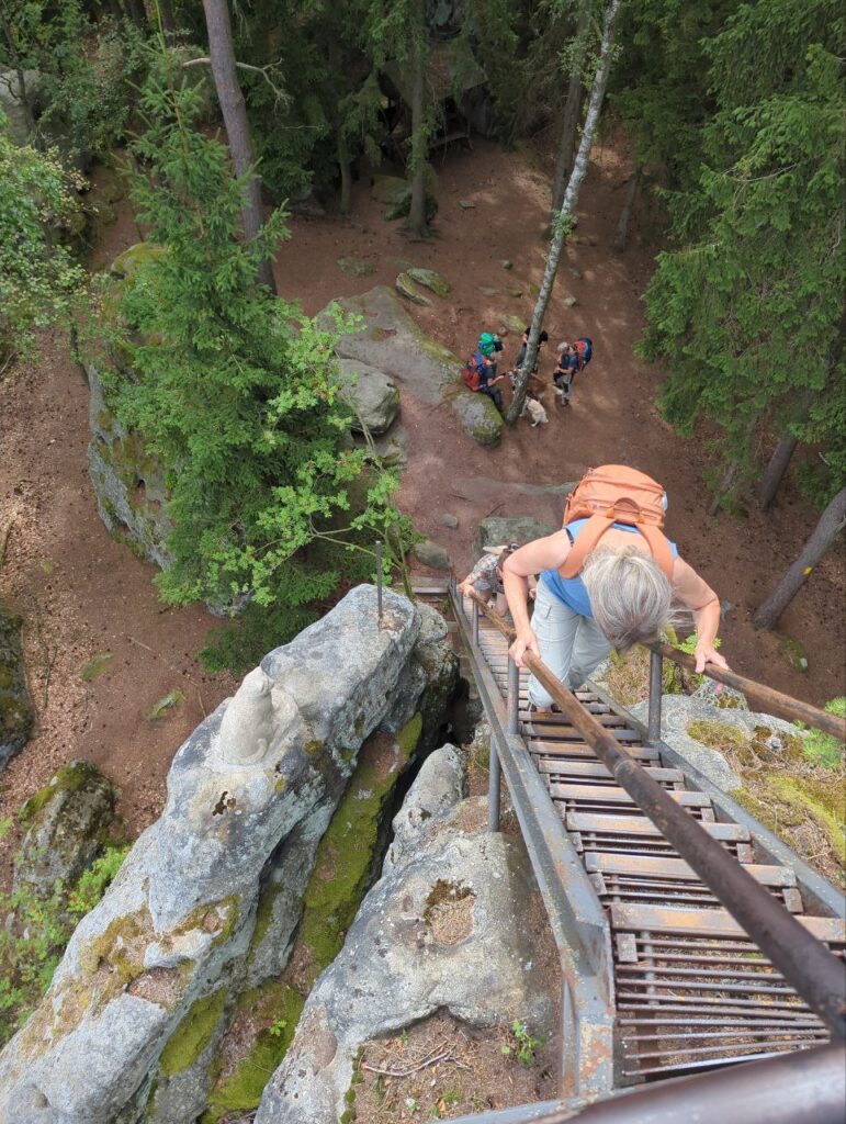 Unseren diesjährigen Wanderurlaub verbrachten wir wie im letzten Jahr im Elbsandsteingebirge, wieder in dem schönen kleinen Holzbungalow am Waldrand bei unseren supernetten Vermietern. Im letzten Jahr hatte ich mit Schrecken die erste steile Stiege im Bielatal gemeistert und danach geäußert: „Das will ich nicht noch mal machen“. Aber steile, schier endlose Auf- und Abstiege auf schmalen Stufen und Leitern sind in dieser Region unvermeidlich. Und so ging es dieses Jahr noch extremer weiter. Die für mich größte Herausforderung war die Rotkehlchenstiege, die durch eine Felsspalte nach oben führt. Ab und zu waren gab es kleine Stufen, in die man gerade mal den Vorfuß setzen konnte. Mit den Händen musste man sich am nackten Fels festhalten, manchmal gab es Baumwurzeln, die als Haltegriffe dienten. An zwei Stellen dachte ich, ich schaffe das nicht. Aber es war klar, daß eine Umkehr ganz und gar unmöglich war. Es blieb nur hochkonzentriertes Weiterkraxeln. Schließlich kamen wir auf einem Plateau an und konnten verschnaufen. Meine Tochter sagte, es sei doch ein sehr erhebendes Gefühl, diese steile Stiege geschafft zu haben. Da kann ich ihr aus ganzem Herzen zustimmen. Während wir uns erholten, kam mit viel Lärm und Lachen eine ca. 30köpfige Gruppe junger Männer die Stiege hoch, offensichtlich völlig problemlos, und nahm dann ohne Pause die nächste Steigung, auch wieder mit sehr viel Getöse. Die hatten jedenfalls deutlich mehr Kondition als wir. Eine Frau, die nach uns hochgestiegen war, erzählte uns, daß diese Stiege „noch gar nichts“ sei. Das Heftigste sei die Häntzschelstiege, wo Metallbügel in einem senkrechten Felskamin als Kletterhilfe dienten. Sie gab allerdings auf mein Nachfragen zu, daß sie diese Stiege nicht genommen habe. Ich habe später Fotos der Häntzschelstiege gesehen und kann nur sagen: Nein danke! Ich habe eine gewisse Höhenangst und gehe nur auf eine Leiter, wenn es unumgänglich ist. Aber hier, wo sich auf fast jedem Wanderweg die eine oder andere Leiter und Treppe findet, musste ich mich viele Male überwinden und stellte nach neun Tagen eine gewisse Gewöhnung bei mir fest. Meine Strategie dabei: nie nach unten schauen, weil das den blanken Horror auslösen würde. Und möglichst auch nicht nach oben sehen, weil es entmutigend sein kann zu sehen, wie lange es noch nach oben weitergeht. Beim Abstieg besonders enger Stufen ohne Geländer ging ich mit dem Gesicht zur Wand. Das hat sich bewährt. Auf jeden Fall bewirken diese Herausforderungen, daß ich voll und ganz in der Gegenwart bin.