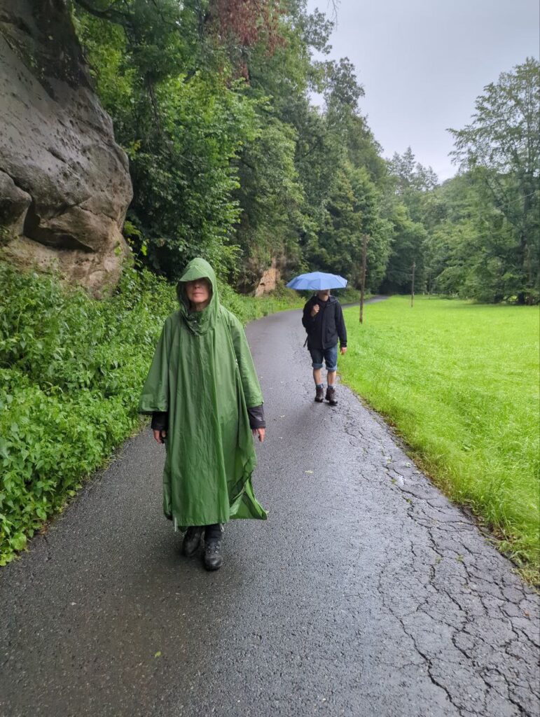 Bei unserer Wanderung im sehr schönen Polenztal gerieten wir in einen deftigen Wolkenbruch. Wir stellten uns unter einen Felsüberhang, aber der Regen hielt an und wir gingen schließlich weiter. Ein Regenponcho, den ich mir vor Jahren gekauft und nie benutzt hatte, kam zum Einsatz und bewährte sich.