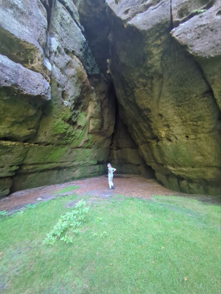 Unseren diesjährigen Wanderurlaub verbrachten wir wie im letzten Jahr im Elbsandsteingebirge, wieder in dem schönen kleinen Holzbungalow am Waldrand bei unseren supernetten Vermietern. Im letzten Jahr hatte ich mit Schrecken die erste steile Stiege im Bielatal gemeistert und danach geäußert: „Das will ich nicht noch mal machen“. Aber steile, schier endlose Auf- und Abstiege auf schmalen Stufen und Leitern sind in dieser Region unvermeidlich. Und so ging es dieses Jahr noch extremer weiter. Die für mich größte Herausforderung war die Rotkehlchenstiege, die durch eine Felsspalte nach oben führt. Ab und zu waren gab es kleine Stufen, in die man gerade mal den Vorfuß setzen konnte. Mit den Händen musste man sich am nackten Fels festhalten, manchmal gab es Baumwurzeln, die als Haltegriffe dienten. An zwei Stellen dachte ich, ich schaffe das nicht. Aber es war klar, daß eine Umkehr ganz und gar unmöglich war. Es blieb nur hochkonzentriertes Weiterkraxeln. Schließlich kamen wir auf einem Plateau an und konnten verschnaufen. Meine Tochter sagte, es sei doch ein sehr erhebendes Gefühl, diese steile Stiege geschafft zu haben. Da kann ich ihr aus ganzem Herzen zustimmen. Während wir uns erholten, kam mit viel Lärm und Lachen eine ca. 30köpfige Gruppe junger Männer die Stiege hoch, offensichtlich völlig problemlos, und nahm dann ohne Pause die nächste Steigung, auch wieder mit sehr viel Getöse. Die hatten jedenfalls deutlich mehr Kondition als wir. Eine Frau, die nach uns hochgestiegen war, erzählte uns, daß diese Stiege „noch gar nichts“ sei. Das Heftigste sei die Häntzschelstiege, wo Metallbügel in einem senkrechten Felskamin als Kletterhilfe dienten. Sie gab allerdings auf mein Nachfragen zu, daß sie diese Stiege nicht genommen habe. Ich habe später Fotos der Häntzschelstiege gesehen und kann nur sagen: Nein danke! Ich habe eine gewisse Höhenangst und gehe nur auf eine Leiter, wenn es unumgänglich ist. Aber hier, wo sich auf fast jedem Wanderweg die eine oder andere Leiter und Treppe findet, musste ich mich viele Male überwinden und stellte nach neun Tagen eine gewisse Gewöhnung bei mir fest. Meine Strategie dabei: nie nach unten schauen, weil das den blanken Horror auslösen würde. Und möglichst auch nicht nach oben sehen, weil es entmutigend sein kann zu sehen, wie lange es noch nach oben weitergeht. Beim Abstieg besonders enger Stufen ohne Geländer ging ich mit dem Gesicht zur Wand. Das hat sich bewährt. Auf jeden Fall bewirken diese Herausforderungen, daß ich voll und ganz in der Gegenwart bin.