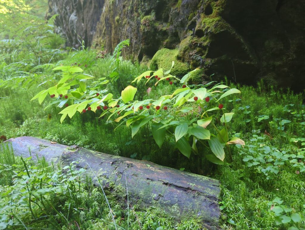 Natürlich gingen wir wie im letzten Jahr den zauberhaften Pfad an den großen schweigenden Steinriesen entlang. Ich verrate seinen Namen nicht; er steht auch nicht in meinem ansonsten sehr ausführlichen Reiseführer. Wir sahen dort nur einen einzigen Menschen, dafür zeigten sich Blindschleichen und Eidechsen. Wir hörten den Kolkraben zu, die mit sonorem Kroh Kroh über die Schluchten flogen. Zweimal fielen ganz in der Nähe krachend tote Fichten um, die wie Riesenmikadostäbe überall herumliegen. Auf den Flächen, auf denen das große Feuer vor drei Jahren gewütet hat, wächst der neue Wald ganz von allein. Das Leben setzt sich immer wieder durch, die Spuren der Vernichtung sind bedeckt vom fröhlichen Grün der Birken. Wie im letzten Jahr war ich ganz beglückt vom Konzept der Nationalparkverwaltung, die Natur hier Natur sein zu lassen, weil sie es einfach am besten weiß. Ich wünsche mir so sehr, daß sich dieses Konzept auch in allen anderen Lebensbereichen durchsetzt. Übrigens fiel mir auf, daß es weit und breit weder die völlig unökologischen Windräder noch Photovoltaikanlagen gab, mit denen der Westen verschandelt wird. Später erfuhr ich, daß man sich bewusst aus Landschaftsschutzgründen dagegen entschieden hat.
